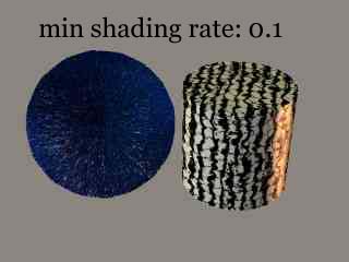 This value defines the size of a "micropolygon", which defines how fine or coarse the resulting render is. By tweaking this parameter, you can trade detail for speed or vice versa. Low values result in sharp renders and slower rendering times, higher values render faster but can lack detal. For production renders, somewhere between 0.5 and 1.0 is a good start. In cases you might have go as low as 0.1. For drafts, don't hesitate to go up to the range of 10-20 for fast renders. When using fine displacement mappings for fur or similar effects, you should use small numbers like 0.2. Note that this parameter is available for each object separately in its properties palette, so you can chose to render a background prop at low detail with a shading rate of 4 and a character in the front with lots of detail at a shading rate of 0.2.